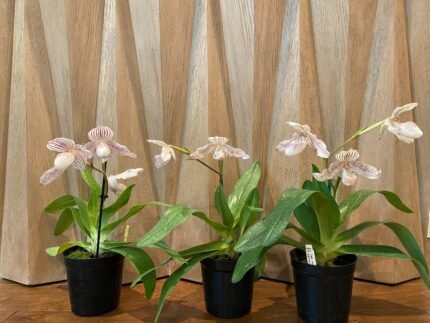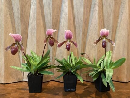 Paph. Jewel Pink (Egrets Jewel x Charlesworthii) Multi-Growths 2 Spikes In Flowers (3.5″ pot)