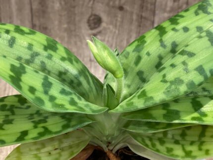 In Spike – Paphiopedilum QF Halawa (urbanianum x violascens) (2” pot)