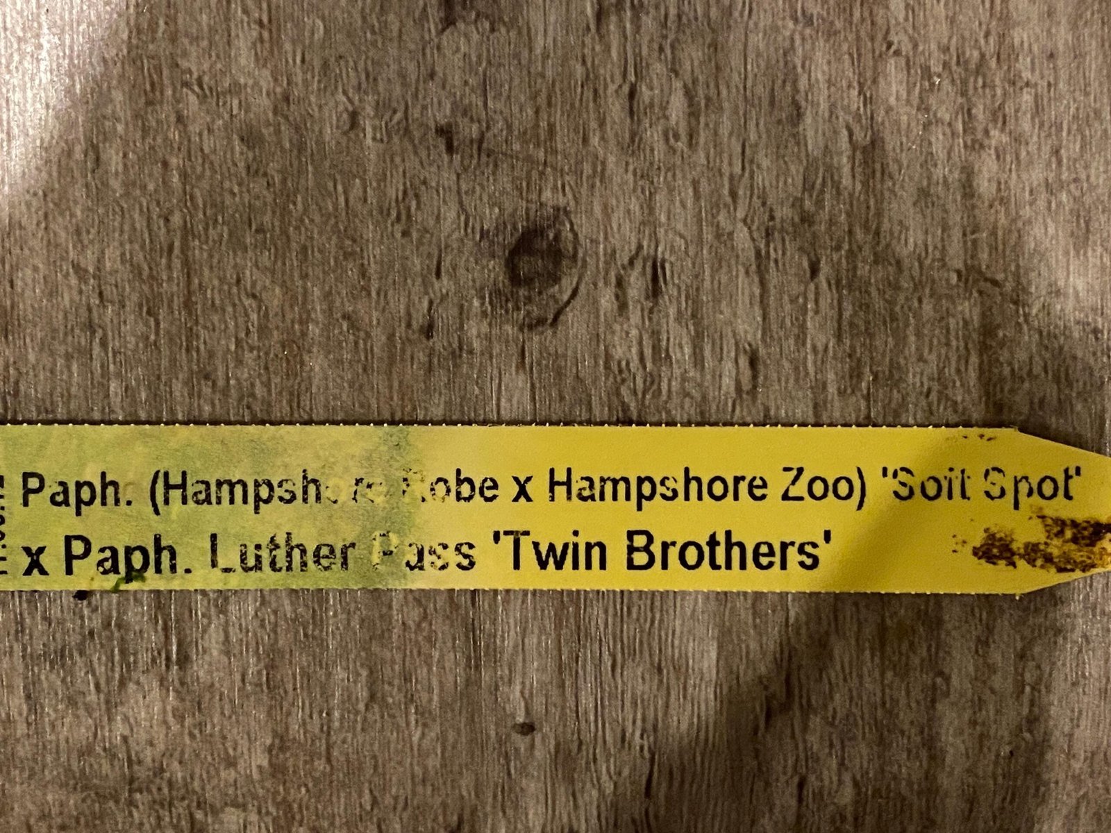 In Spike Paph. (Hampshore Robe x Hampshore Zoo) ‘Soil Spot’ x Paph. Luther Pass ‘Twin Brothers’ (3.5” pot)