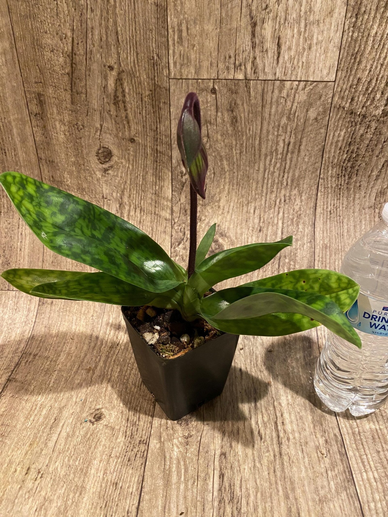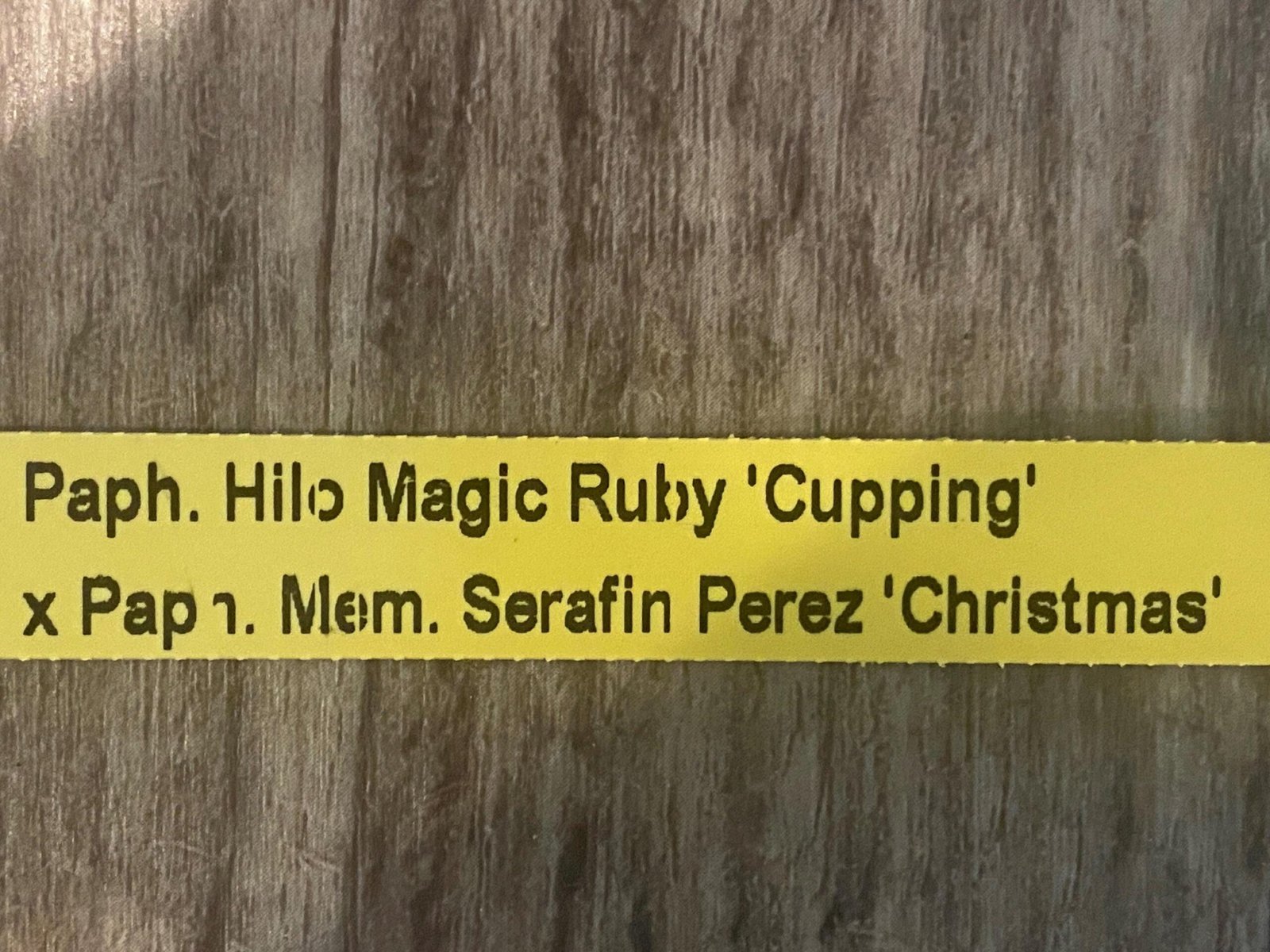 In Spike Paph. Hilo Magic Ruby ‘Cupping’ x Paph. Mem. Serafin Perez ‘Christmas’ (3.5” pot)