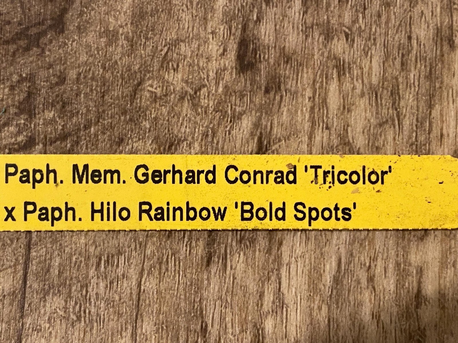 Tag: In Spike Paph. Mem. Gerhard Conrad 'Tricolor' x Paph. Hilo Rainbow 'Bold Spots'