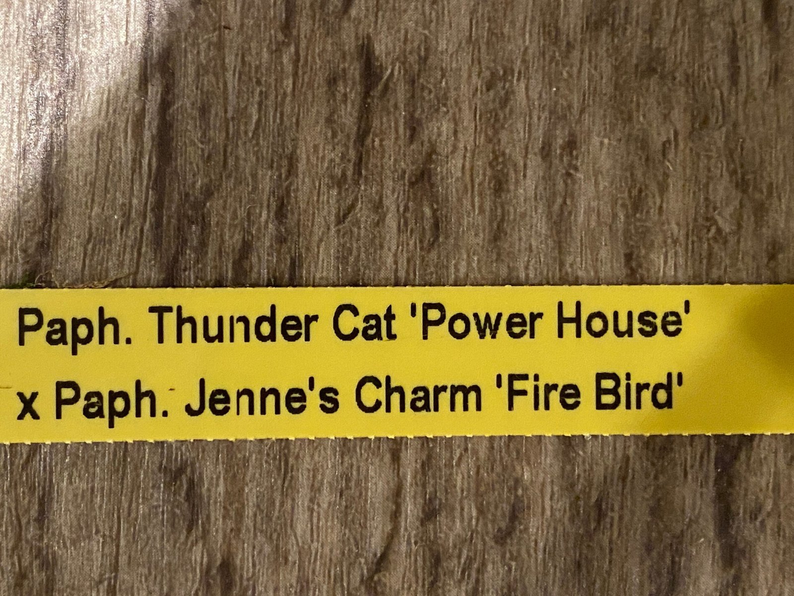 In Spike Paph. Thunder Cat ‘Power House’ × Paph. Jenne’s Charm ‘Fire Bird’ + 1 New Growth (3.5” Pot)