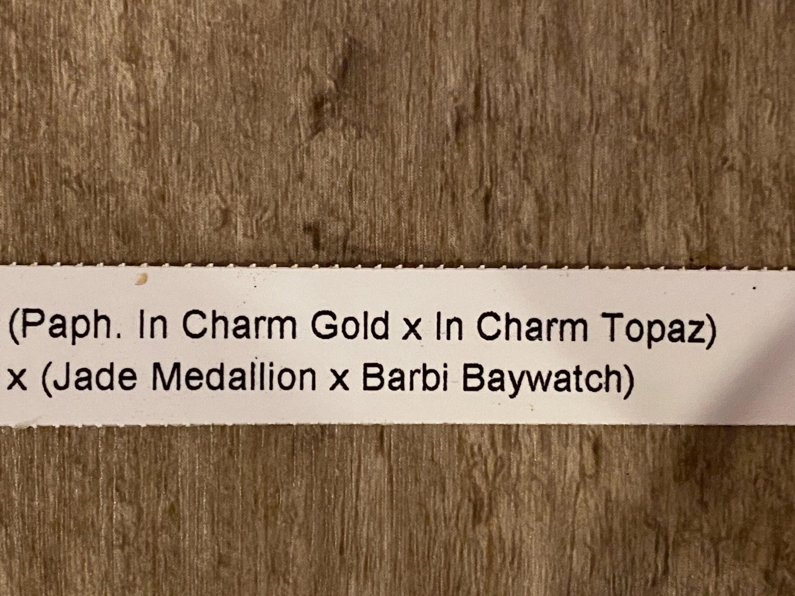 Paph. (In Charm Gold x in Charm Topaz) × (Jade Medallion × Barbi Baywatch) (3.5” pot)